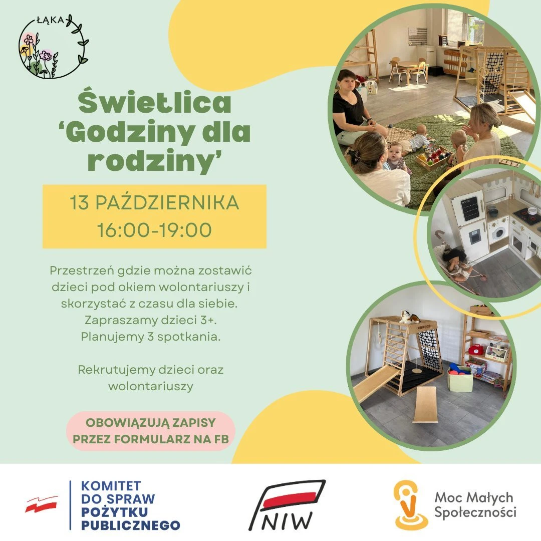 Fundacja Rodzinny Kolektyw prowadząca w Ostrołęce Mikroszkołę Łąkę zaprasza rodziny do bezpłatnego projektu 'Godziny dla Rodziny – przeciwdziałanie wypaleniu rodzicielskiemu. W ramach inicjatywy organizowane są zajęcia świetlicowe dla najmłodszych.