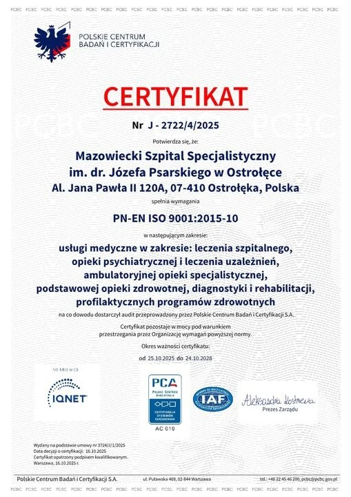 Mazowiecki Szpital Specjalistyczny im. dr. Józefa Psarskiego w Ostrołęce został nagrodzony certyfikatem PN-EN ISO 9001:2015 wydanym przez Polskie Centrum Badań i Certyfikacji S.A.