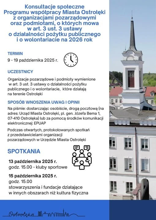 Urząd Miasta Ostrołęki przedstawicieli stowarzyszeń, fundacji i klubów sportowych do udziału w konsultacjach Rocznego Programu Współpracy z Organizacjami Pozarządowymi na 2026 rok. To doskonała okazja, by wspólnie porozmawiać o ważnych dla miasta sprawach, przedstawić swoje pomysły, opinie i uwagi dotyczące planowanych działań.