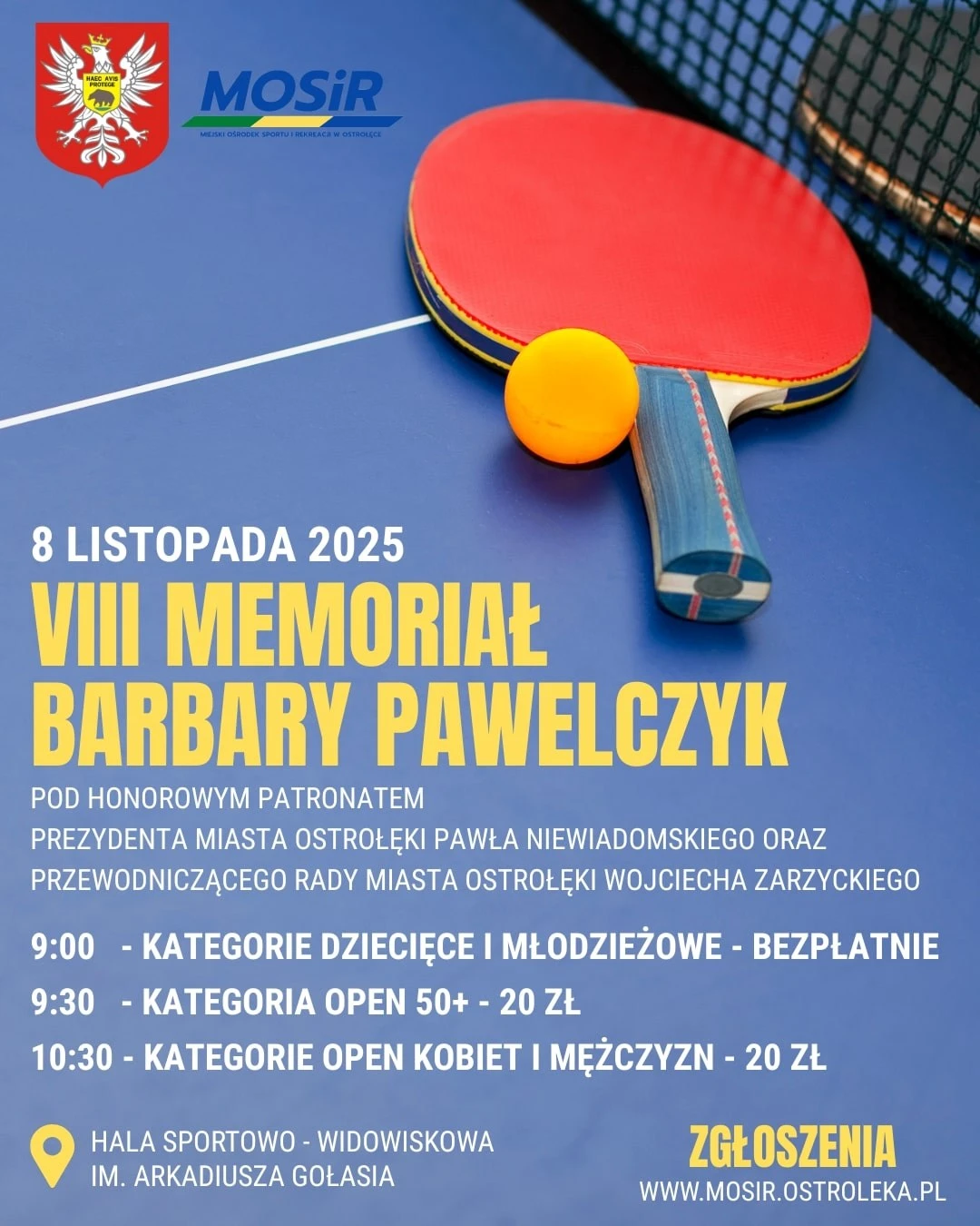 VIII Memoriał im. Barbary Pawelczyk w tenisie stołowym pod honorowym patronatem Prezydenta Miasta Ostrołęki Pawła Niewiadomskiego i Przewodniczącego Rady Miasta Ostrołęki Wojciecha Zarzyckiego odbędzie się 8 listopada w hali widowiskowo-sportowej im. Arkadiusza Gołasia w Ostrołęce.