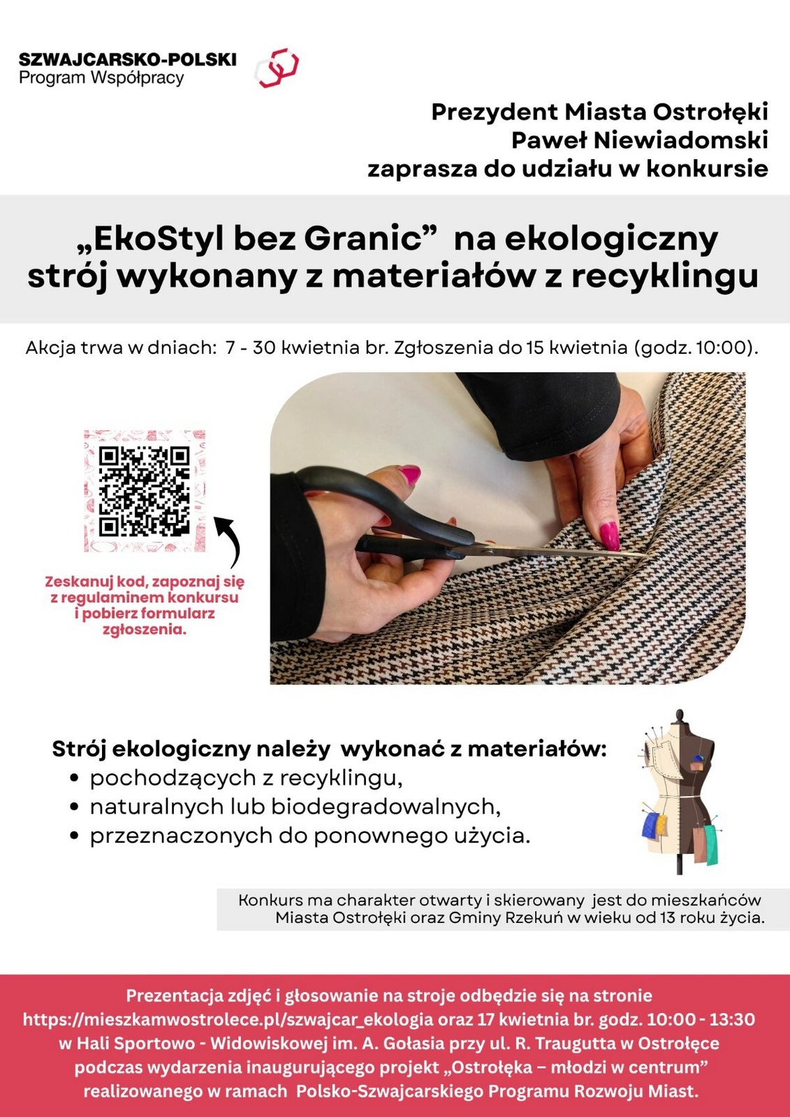 Prezydent Paweł Niewiadomski zaprasza mieszkańców Ostrołęki oraz gminy Rzekuń do udziału w konkursie 'EkoStyl bez Granic”, organizowanym w ramach Polsko-Szwajcarskiego Programu Rozwoju Miast. Zadaniem uczestników jest wykonanie ekologicznego stroju z materiałów pochodzących z recyklingu, naturalnych, biodegradowalnych lub przeznaczonych do ponownego użycia.