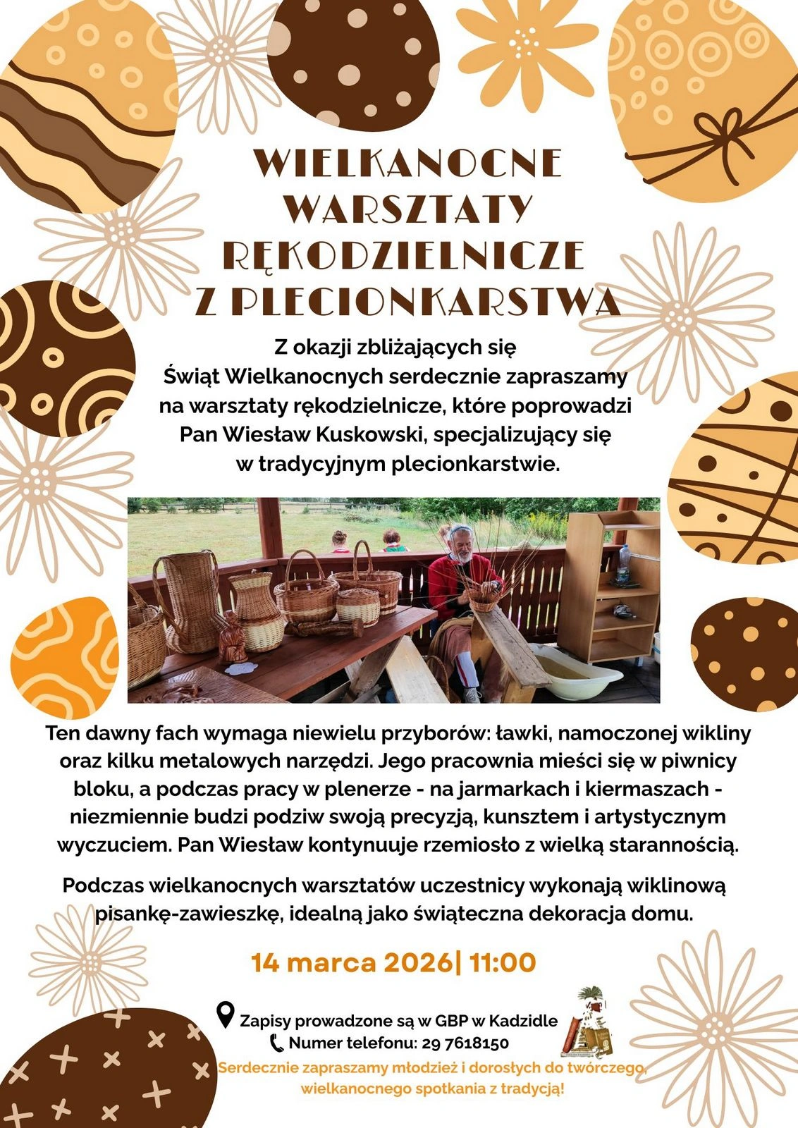 Gminna Biblioteka Publiczna w Kadzidle zaprasza na warsztaty plecionkarskie, które odbędą się 14 marca o godzinie 11:00 w siedzibie biblioteki. Zajęcia poprowadzi Wiesław Kuskowski, specjalizujący się w tradycyjnym plecionkarstwie. Uczestnicy będą mieli możliwość wykonania wiklinowej pisanki-zawieszki jako dekoracji do domu.