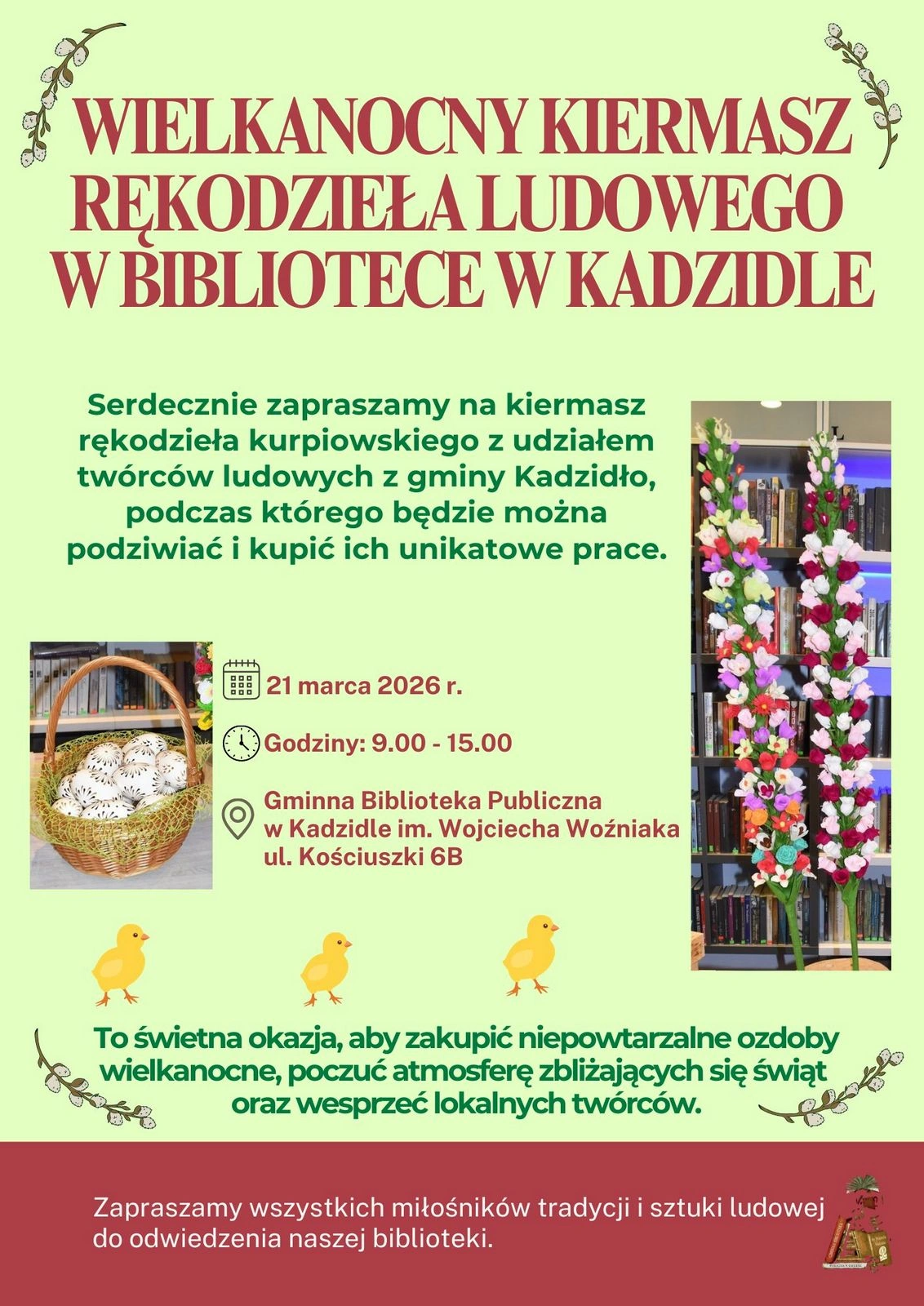 21 marca, Gminna Biblioteka Publiczna w Kadzidle zaprasza na kiermasz rękodzieła kurpiowskiego z udziałem twórców ludowych. Wydarzenie odbędzie się w godzinach od 9:00 do 15:00.