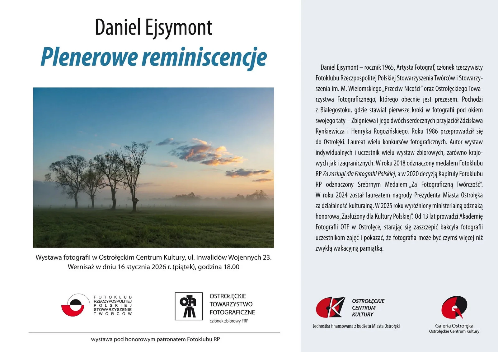 Ostrołęckie Centrum Kultury zaprasza 16 stycznia o godzinie 18 na wernisaż wystawy fotografii Daniela Ejsymonta zatytułowaną 'Plenerowe reminiscencje’.