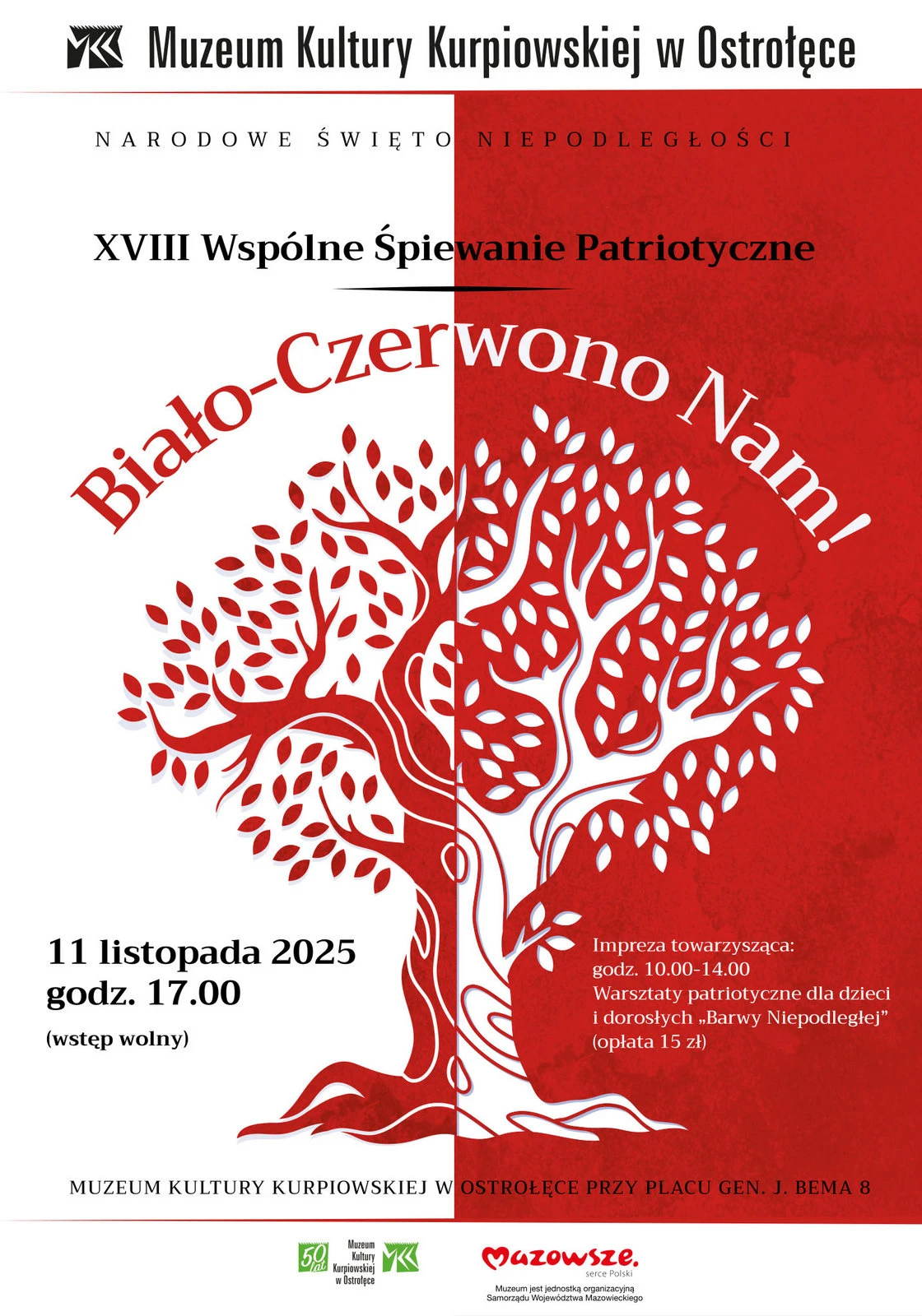 Muzeum Kultury Kurpiowskiej w Ostrołęce zaprasza 11 listopada na wspólne świętowanie Dnia Niepodległości.