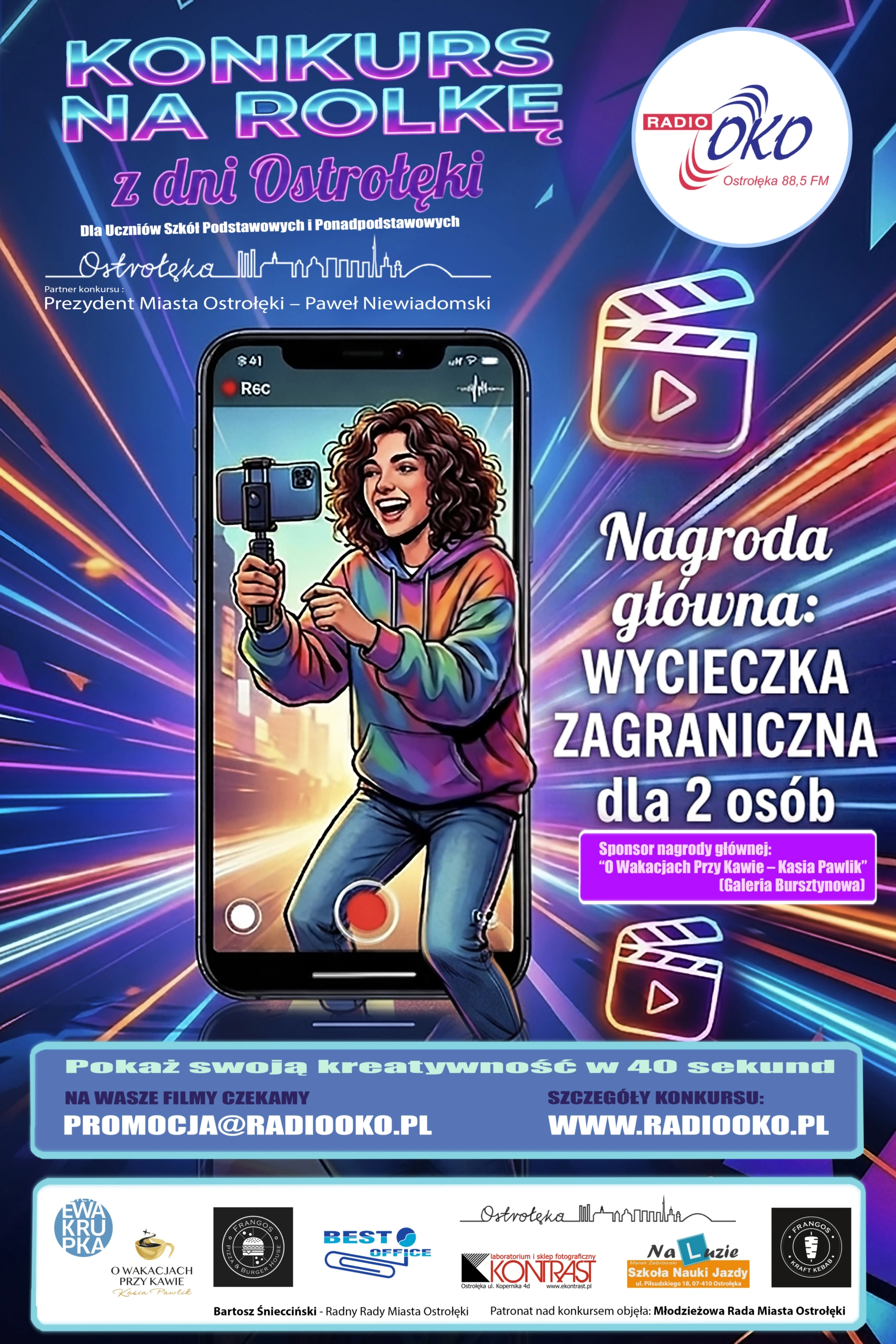 Masz oko do ciekawych ujęć? Lubisz nagrywać rolki i dzielić się swoim światem w social mediach? To coś dla Ciebie! Radio OKO zaprasza uczniów szkół podstawowych i ponadpodstawowych do udziału w konkursie „Złap Moment – Konkurs na Rolkę z Dni Ostrołęki”. Nagroda główna to wycieczka zagraniczna dla 2 osób ufundowana przez biuro podróży „O wakacjach przy kawie – Kasia Pawlik”. Partnerem akcji jest prezydenta Miasta Ostrołęki.